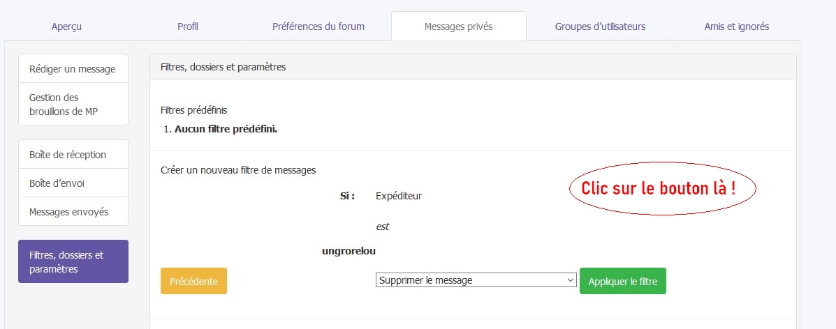 Vous avez la possibilité de filtrer les messages entrant et de bloquer les message d' un utilisateur dont vous ne souhaitez pas ou plus recevoir de message privé grâce à la procédure décrite ci-dessous.